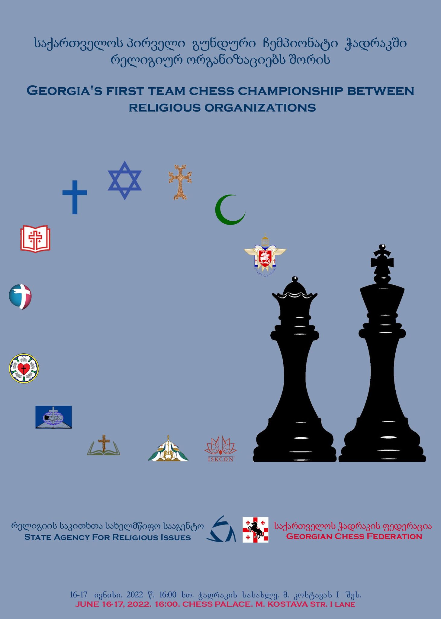 16-17 ივნისს, 16.00 საათზე, ჭადრაკის სასახლეში (მისამართი: თბილისი, კოსტავას ქუჩა 37ა) გაიმართება საქართველოს პირველი ინტერრელიგიური ჩემპიონატი ჭადრაკში, რომელიც სწრაფი ჭადრაკის ფორმატში (15 წთ. – 10 წმ-ის დამატებით) ჩატარდება. მონაწილეობა შეუძლიათ როგორც სასულიერო პირებს, ასევე, მრევლს (კონკრეტული კონფესიის წარმომადგენელს). ტურნირი დასრულდება დაჯილდოების ცერემონიით.