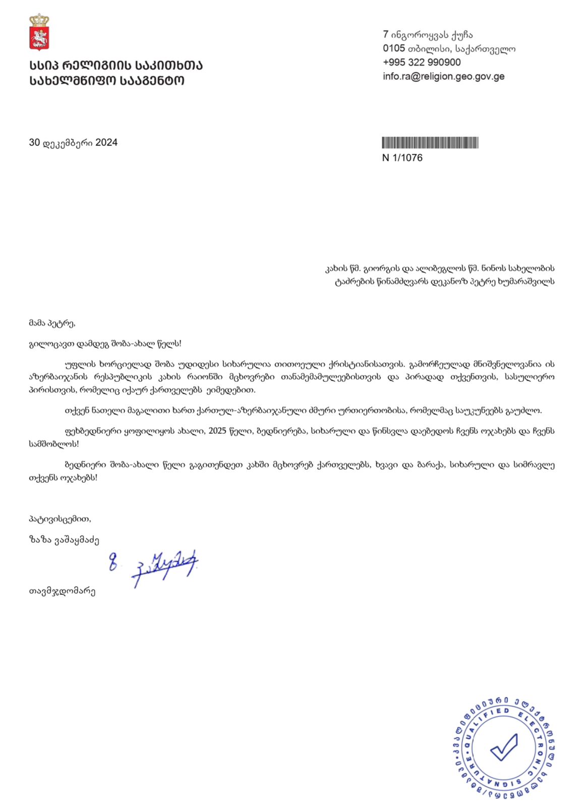აზერბაიჯანში მოღვაწე დეკანოზ მამა პეტრე ხუმარაშვილს და მის მრევლს რელიგიის სააგენტო შობა-ახალ წელს ულოცავს