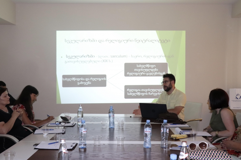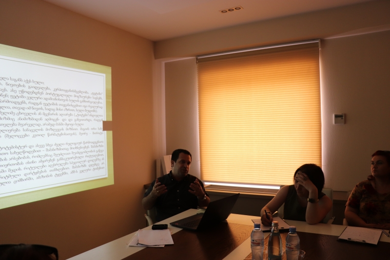 Today, the employees of the State Agency for Religious Issues held seminars today for the teachers of Z. Zhvania School of Public Administration. Reports on the status of human rights and religious diversity in Georgia and the state of the religious organizations in Georgia were conducted by the senior specialists of the agency’s Strategic Research, Analysis and Regional Service: Zviad Tkabladze and Sergo Parulava, and the senior specialist of the Legal Maintenance Office of the agency Davit Davitashvili.