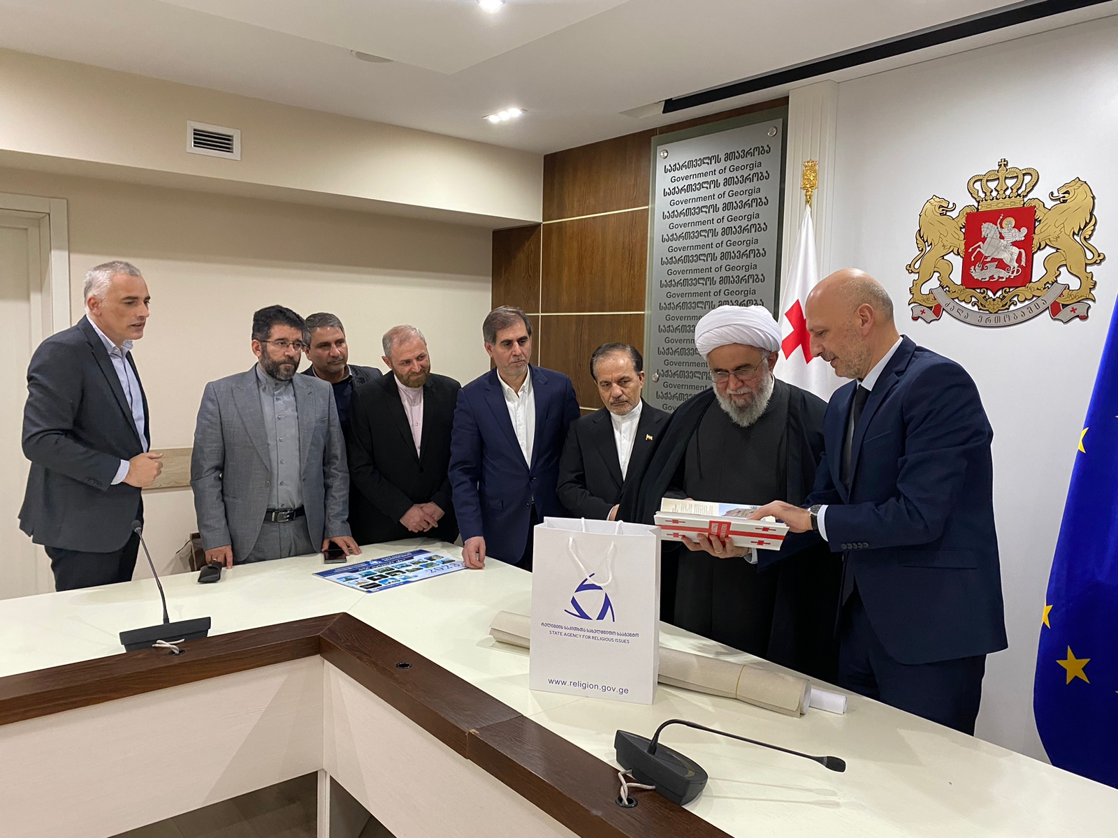 Today, at the Administration of the Government of Georgia, the chairman of the Agency, Zaza Vashakmadze, met with the delegation of the Islamic Republic of Iran. Ayatollah Reza Ramezani, Secretary General of the Ahl Beit World Assembly, Abdolreza Rashed, Deputy Head of International Affairs of the Ahl Beit World Assembly, and Hasan Sadekyani, Head of the CIS and Turkey Division of the Ahl Beit World Assembly, are visiting Tbilisi. Along with the Iranian guests, the Agency was visited by the Ambassador Extraordinary and Plenipotentiary of the Islamic Republic of Iran to Georgia, Mahmoud Adib, the adviser of the Embassy on cultural affairs, Ahmad Ali Mehri Ardestani, the representative of Almostafa University, Hassan Yousefzadeh, and the employee of the Department of Culture, Mahdi Zare. The chairman of the Agency introduced the activities of the State Agency for Religious Issues to the guests. He emphasized the Georgian phenomenon of Islam, the harmonious and peaceful coexistence of Shiite and Sunni Muslims in Georgia and cited their joint prayer as an example.