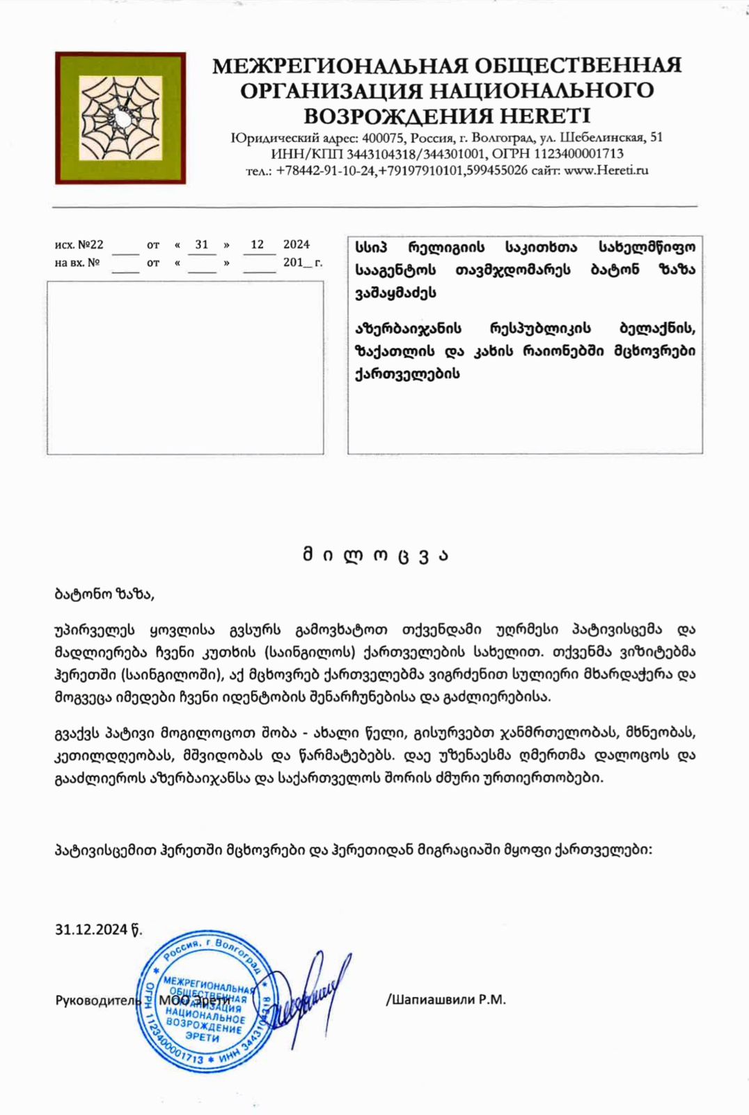 აზერბაიჯანში მცხოვრები თანამემამულეები ზაზა ვაშაყმაძეს შობა-ახალ წელს ულოცავენ