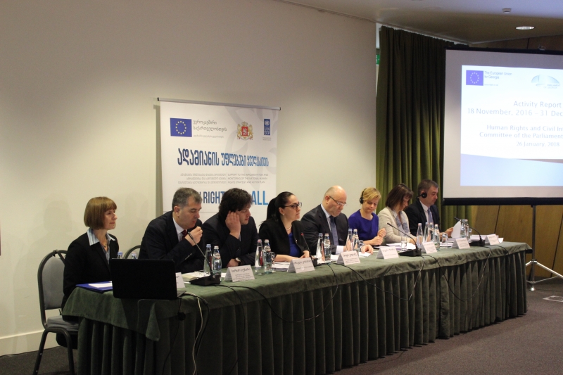 დღეს საქართველოს პარლამენტის ადამიანის უფლებათა დაცვისა და სამოქალაქო ინტეგრაციის კომიტეტის მიერ გაწეული საქმიანობის ანგარიშის პრეზენტაცია გაიმართა, რომელსაც საქართველოს პარლამენტის თავმჯდომარე, ირაკლი კობახიძე, პარლამენტის ადამიანის უფლებათა დაცვისა და სამოქალაქო ინტეგრაციის კომიტეტის თავმჯდომარე, სოფო კილაძე, საქართველოს თავდაცვის მინისტრი, ლევან იზორია, საქართველოს ოკუპირებული ტერიტორიებიდან იძულებით გადაადგილებულ პირთა განსახლებისა და ლტოლვილთა მინისტრი, სოზარ სუბარი, რელიგიის საკითხთა სახელმწიფო სააგენტოს თავმჯდომარე, ზაზა ვაშაყმაძე, საქართველოს მართლმადიდებელი სამოციქულო ავტოკეფალური ეკლესიის, სრულიად საქართველოს მუსლიმთა სამმართველოს, სომეხთა სამოციქულო მართლმადიდებელი წმიდა ეკლესიის საქართველოს ეპარქიის, საქართველოს ებრაელთა თემის, საქართველოს ეზიდთა სასულიერო საბჭოს, საქართველოს ევანგელურ-პროტესტანტული ეკლესიის, ევანგელურ-ლუთერული ეკლესიის, საქართველოს სახარების რწმენის ეკლესიის, საქართველოს სახარების ქრისტიან-ბაპტისტთა ეკლესიების კავშირის, დიპლომატიური კორპუსისა და სამოქალაქო სექტორის წარმომადგენლები ესწრებოდნენ.