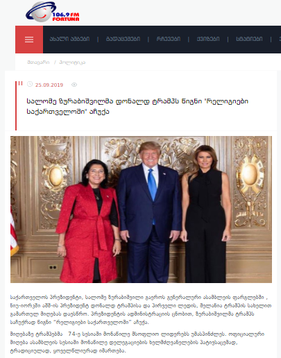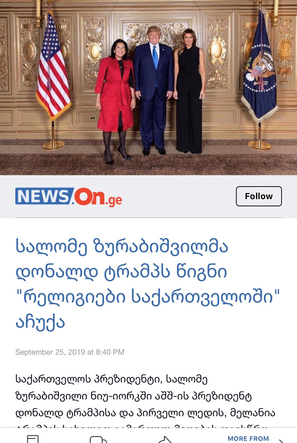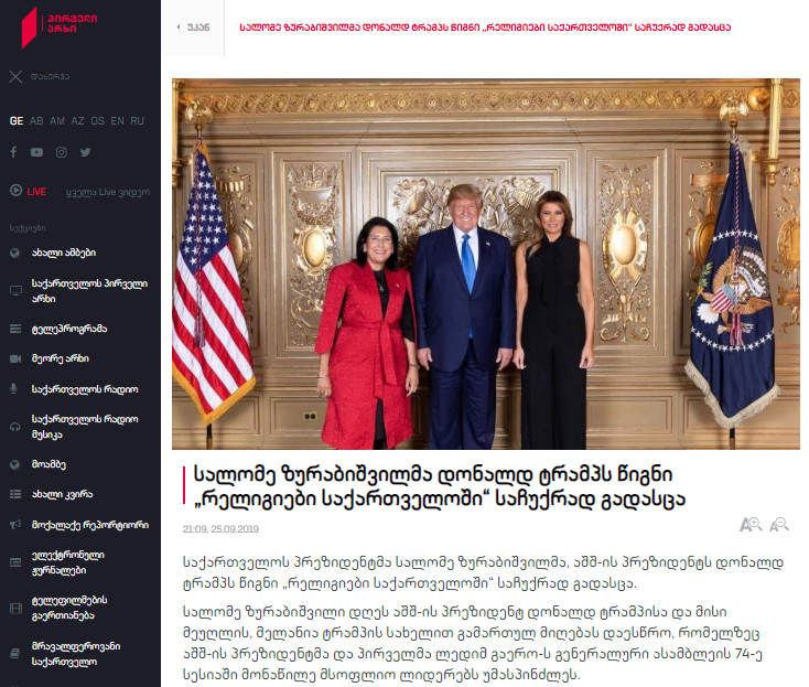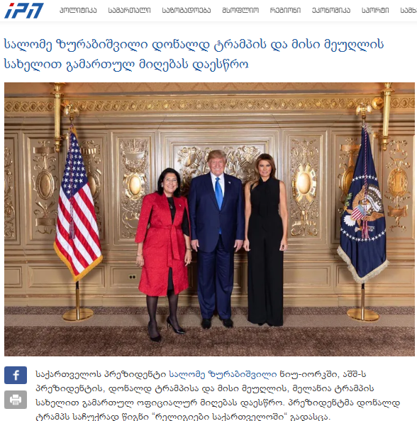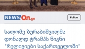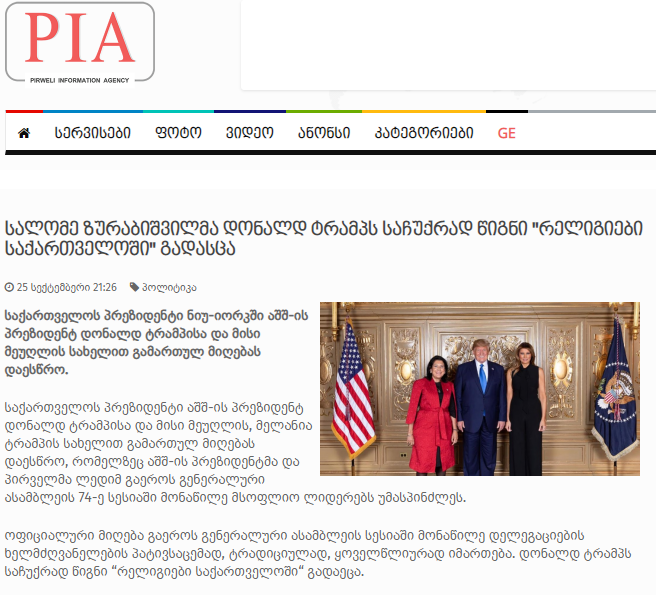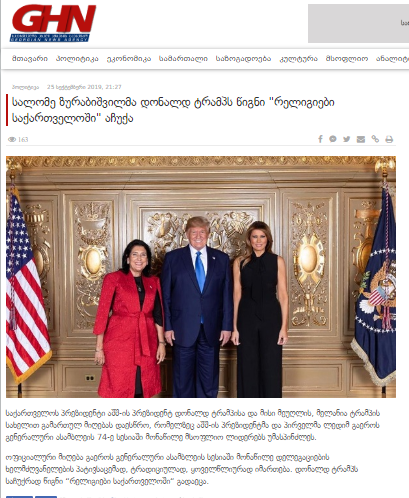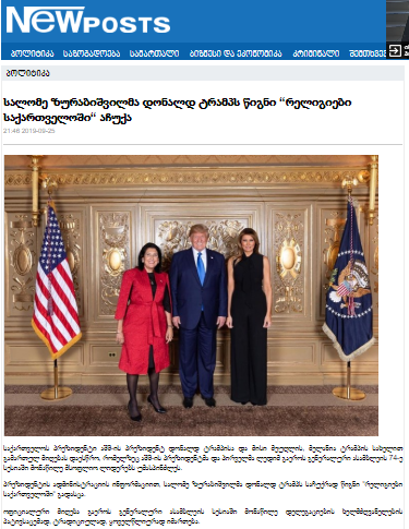 საქართველოს პრეზიდენტი, სალომე ზურაბიშვილი ნიუ-იორკში, აშშ-ის პრეზიდენტ დონალდ ტრამპისა და პირველი ლედის, მელანია ტრამპის სახელით გამართულ მიღებას დაესწრო. ზურაბიშვილმა ტრამპს საჩუქრად რელიგიის საკითხთა სახელმწიფო სააგენტოს მიერ გამოცემული წიგნი, „რელიგიები საქართველოში" აჩუქა.