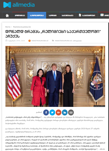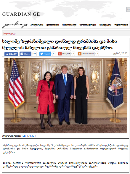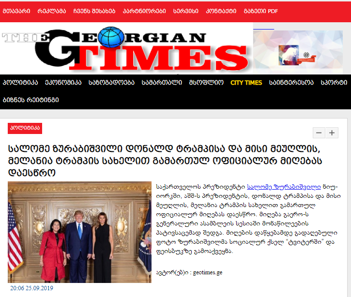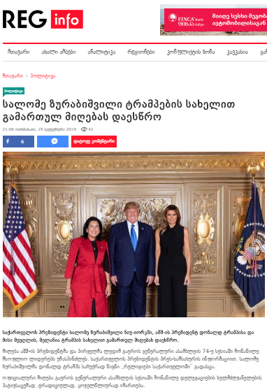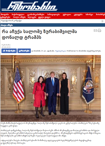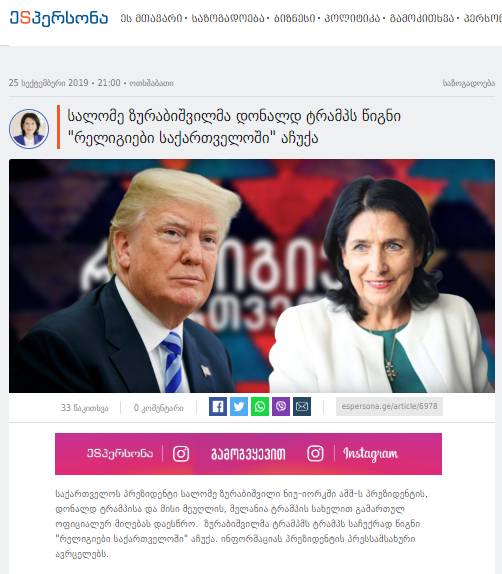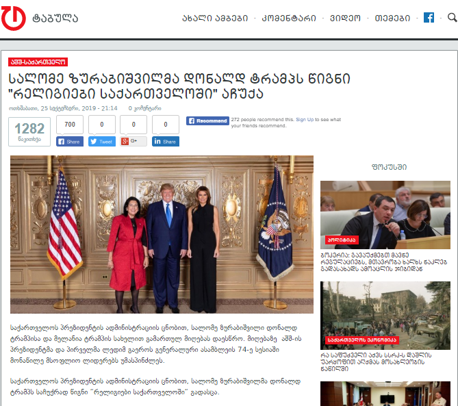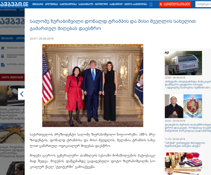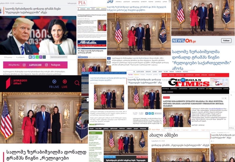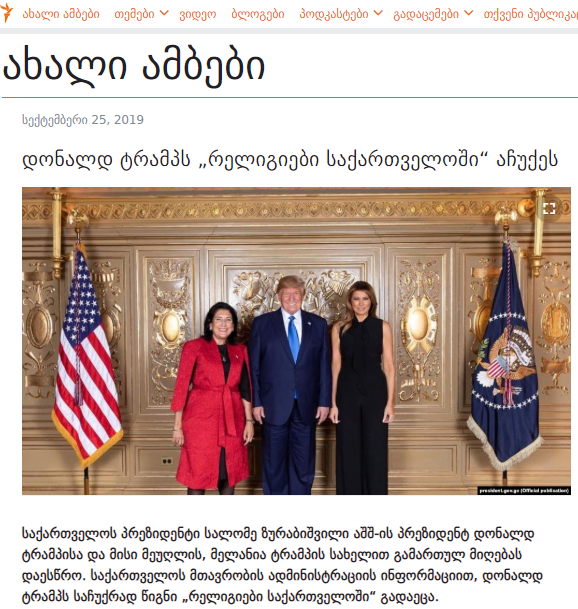 საქართველოს პრეზიდენტი, სალომე ზურაბიშვილი ნიუ-იორკში, აშშ-ის პრეზიდენტ დონალდ ტრამპისა და პირველი ლედის, მელანია ტრამპის სახელით გამართულ მიღებას დაესწრო. ზურაბიშვილმა ტრამპს საჩუქრად რელიგიის საკითხთა სახელმწიფო სააგენტოს მიერ გამოცემული წიგნი, „რელიგიები საქართველოში" აჩუქა.