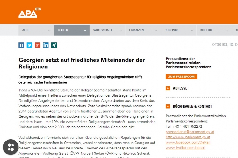 „საქართველოს არჩევანია რელიგიათა მშვიდობიანი თანაცხოვრება“ - ასეთი სათაურით ავსტრიის საპარლამენტო დირექციის პრეს-სამსახურმა გაავრცელა ინფორმაცია საქართველოს რელიგიის საკითხთა სახელმწიფო სააგენტოს ავსტრიის რესპუბლიკის პარლამენტში ვიზიტის შესახებ, რომელშც ნათქვამია: