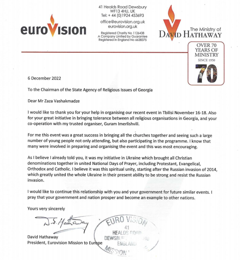 მადლობა მინდა გადაგიხადოთ დახმარებისათვის, თბილისში 16-18 ნოემბრს, ჩვენი ბოლო ღონისძიების ორგანიზებაში. ასევე მადლობას გიხდით, საქართველოში ყველა რელიგიურ ორგანიზაციას შორის ტოლერანტობის დამყარების ინიციატივისთვის და ჩემს სანდო ორგანიზატორთან, გურამ იმერლიშვილთან თანამშრომლობისათვის.